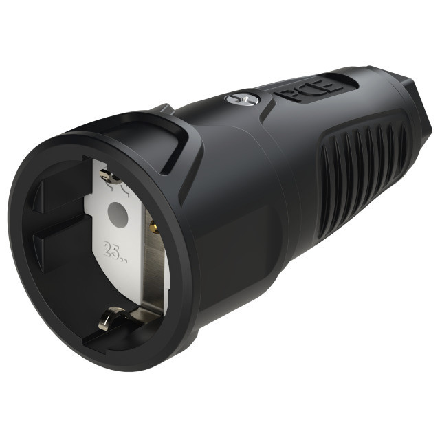 Schutzkontaktkupplung Serie TAURUS2 - Gummi; Farbe (Haube/Ring): schwarz/schwarz; Material (Haube/Kontaktträger): TPE/PA6; Schutzkontaktsystem: österr./deutsch ; 16A / 250V AC / 3p (2P+E), Schutzart: IP20