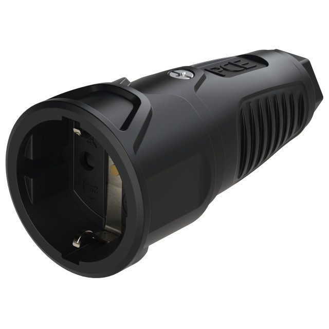 Schutzkontaktkupplung Serie TAURUS2 - Gummi; Farbe (Haube/Ring): schwarz/schwarz; Material (Haube/Kontaktträger): TPE/PA6; Schutzkontaktsystem: österr./deutsch mit Shutter; 16A / 250V AC / 3p (2P+E), Schutzart: IP20