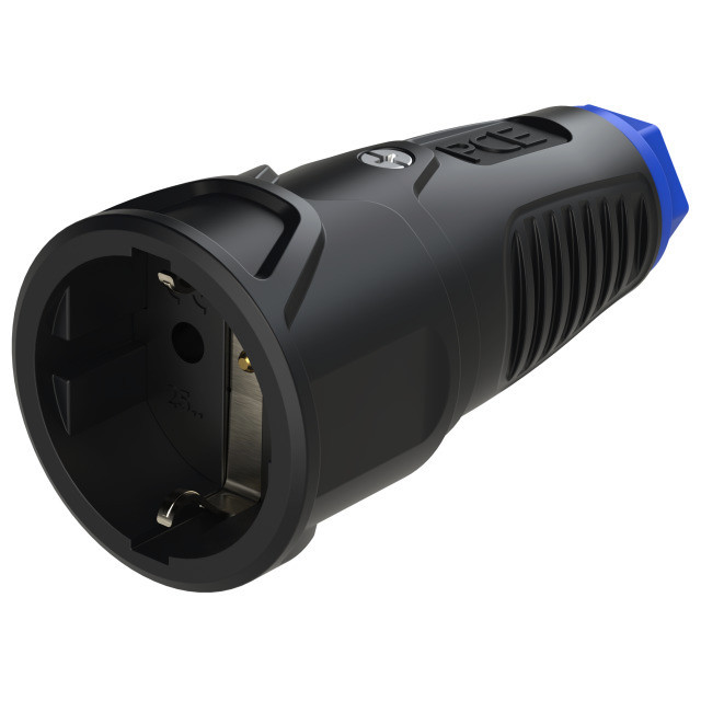 Schutzkontaktkupplung Serie TAURUS2 - Vollgummi; Farbe (Haube/Ring): schwarz/blau; Material (Haube/Kontaktträger): TPE/TPE; Schutzkontaktsystem: österr./deutsch ; 16A / 250V AC / 3p (2P+E), Schutzart: IP20