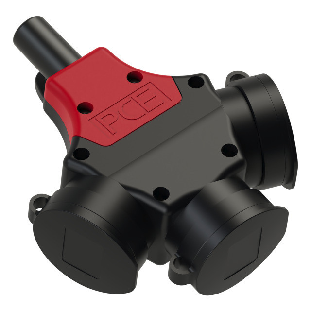 3-Wege Schutzkontaktkupplung Gummi mit Deckel (Deckelband); 16A 2p+E 250V IP44 (nach österr./deutsch. System); Einsatz: Polyamid; innenliegende Zugentlastung; 5-polige Anschlussklemme; für erschwerte Bedingungen; Schutzart: IP44