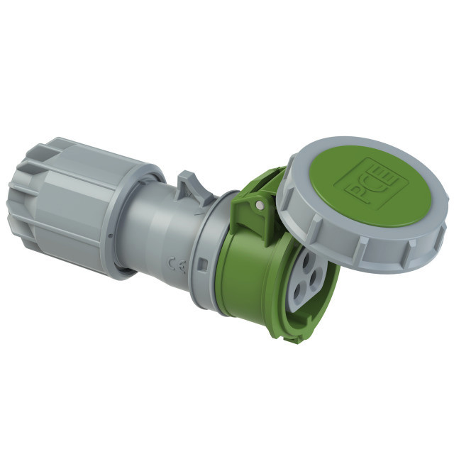 CEE-Kupplung 32A 3p 24/42VAC 100-200Hz IP67 TWIST; Gehäusematerial: PA6; Nennstrom: 32A; Polzahl: 3 (3P); Uhrzeit-Stellung: 4h; Nennspannung/Frequenz: 24/42V~ / 100-200Hz; Kontakte: Messing vernickelt; Anschlusstechnik: Schraubklemmen; Schutzart: IP67