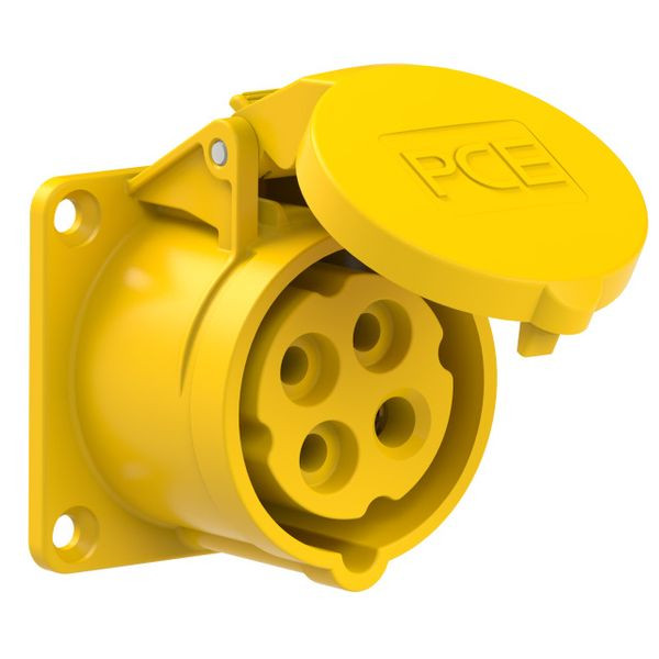 CEE-Anbausteckdose gerade (65x65mm) 16A 4p 4h IP44/IP54; Gehäusematerial: PA6; Nennstrom: 16A; Polzahl: 4 (3P+PE); Uhrzeit-Stellung: 4h; Nennspannung/Frequenz: 100-130V~ / 50+60Hz; Kontakte: Messing; Anschlusstechnik: Schraubklemmen; Abmessungen (Flansch/Bohrung): 65x65 mm / 52x52 mm; Schutzart: IP44/IP54
