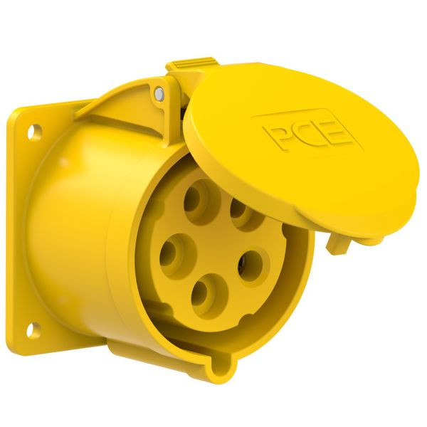 CEE-Anbausteckdose gerade (75x75mm) 32A 5p 4h IP44/IP54 TT; Gehäusematerial: PA6; Nennstrom: 32A; Polzahl: 5 (3P+N+PE); Uhrzeit-Stellung: 4h; Nennspannung/Frequenz: 57/100V~ - 75/130V~ / 50+60Hz; Kontakte: Messing; Anschlusstechnik: schraublose Anschlusstechnik (TT); Abmessungen (Flansch/Bohrung): 75x75 mm / 60x60 mm; Schutzart: IP44/IP54
