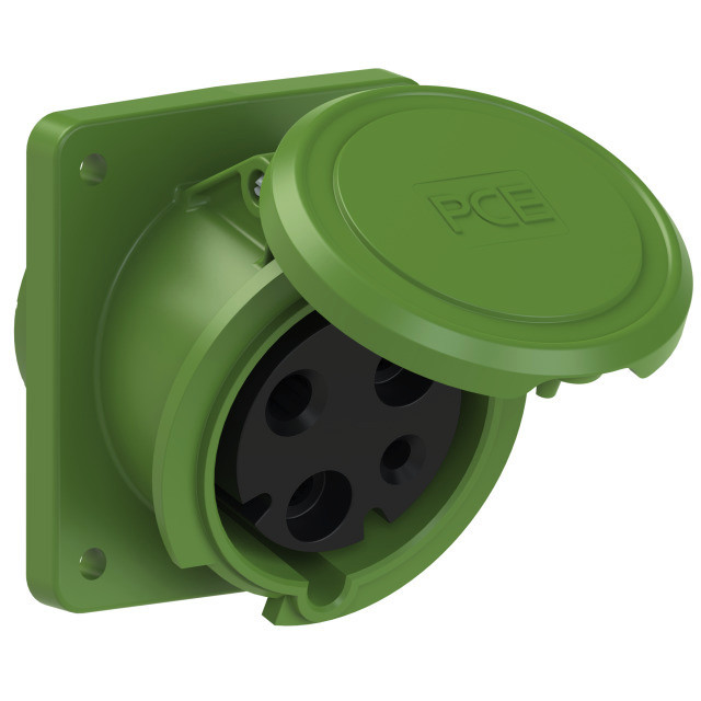 CEE-Anbausteckdose schräg (100x112) 63A 3p 10h IP44 POWER TWIST; Gehäusematerial: PA6; Nennstrom: 63A; Polzahl: 3 (2P+PE); Uhrzeit-Stellung: 10h; Nennspannung/Frequenz: >50V~ / 100-300Hz; Kontakte: Messing, mit Lamellenkontakt (CuBe); Anschlusstechnik: Rahmenklemmen mit Schrauben; Abmessungen (Flansch/Bohrung): 100x112 mm / 80x88 mm; Schutzart: IP44