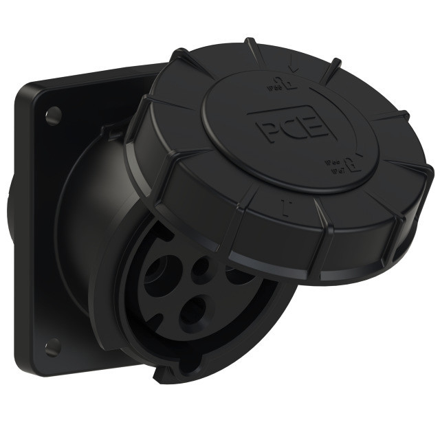 CEE-Anbausteckdose schräg (100x112) 63A 4p 6h IP67 POWER TWIST schwarz; Gehäusematerial: PA6; Nennstrom: 63A; Polzahl: 4 (3P+PE); Uhrzeit-Stellung: 6h; Nennspannung/Frequenz: 380-415V~ / 50+60Hz; Kontakte: Messing, mit Lamellenkontakt (CuBe); Anschlusstechnik: Rahmenklemmen mit Schrauben; Abmessungen (Flansch/Bohrung): 100x112 mm / 80x88 mm; Schutzart: IP66/IP67