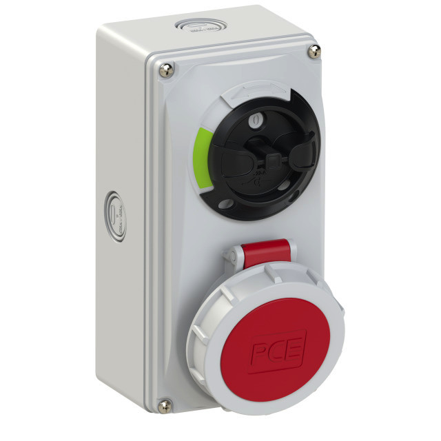 CEE-Steckdose abschaltbar kompakt 16A 4p 6h IP66/IP67 Knock Out; Gehäusematerial: PA6 + PC/ABS; Nennstrom: 16A; Polzahl: 4 (3P+PE); Uhrzeit-Stellung: 6h; Nennspannung/Frequenz: 380-415V~ / 50+60Hz; Kontakte: Messing vernickelt; Anschlusstechnik: Schraubklemmen; Wanddose mit Ausbrüchen, mechanisch verriegelt; Schalter: EIN/AUS PCE-Merz ML0; EN 60947-3; AC22A, 10kA; Schutzart: IP66/IP67