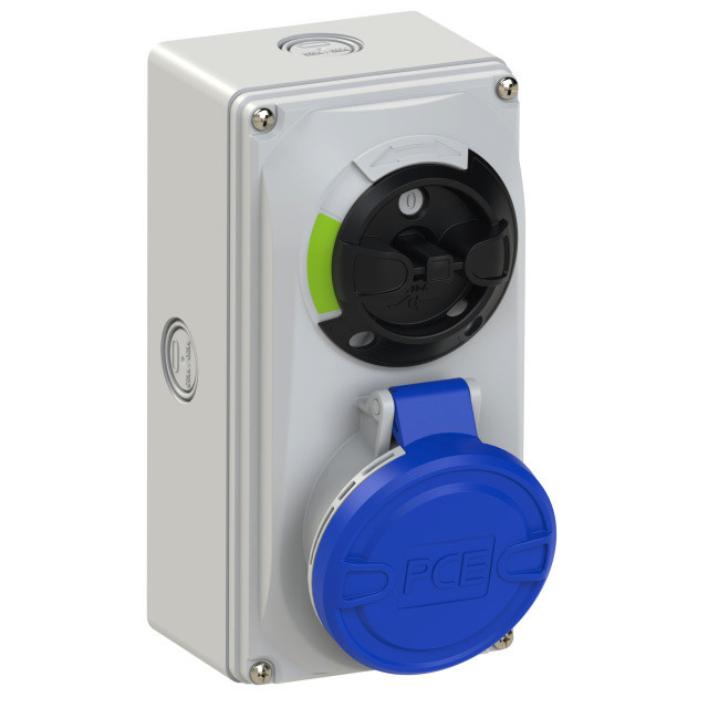 CEE-Steckdose abschaltbar kompakt 16A 5p 9h IP44/IP54 Knock Out; Gehäusematerial: PA6 + PC/ABS; Nennstrom: 16A; Polzahl: 5 (3P+N+PE); Uhrzeit-Stellung: 9h; Nennspannung/Frequenz: 120/208V~ - 144/250V~ / 50+60Hz; Kontakte: Messing vernickelt; Anschlusstechnik: Schraubklemmen; Wanddose mit Ausbrüchen, mechanisch verriegelt; Schalter: EIN/AUS PCE-Merz ML0; EN 60947-3; AC22A, 10kA; Schutzart: IP44/IP54