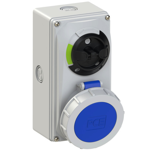 CEE-Steckdose abschaltbar kompakt 32A 3p 6h IP66/IP67 Knock Out; Gehäusematerial: PA6 + PC/ABS; Nennstrom: 32A; Polzahl: 3 (2P+PE); Uhrzeit-Stellung: 6h; Nennspannung/Frequenz: 200-250V~ / 50+60Hz; Kontakte: Messing vernickelt; Anschlusstechnik: Schraubklemmen; Wanddose mit Ausbrüchen, mechanisch verriegelt; Schalter: EIN/AUS PCE-Merz ML0; EN 60947-3; AC22A, 10kA; Schutzart: IP66/IP67