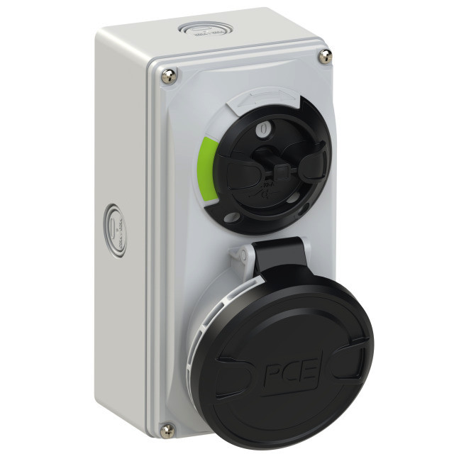 CEE-Steckdose abschaltbar kompakt 32A 5p 7h IP44/IP54 Knock Out; Gehäusematerial: PA6 + PC/ABS; Nennstrom: 32A; Polzahl: 5 (3P+N+PE); Uhrzeit-Stellung: 7h; Nennspannung/Frequenz: 277/480V~ - 288/500V~ / 50+60Hz; Kontakte: Messing vernickelt; Anschlusstechnik: Schraubklemmen; Wanddose mit Ausbrüchen, mechanisch verriegelt; Schalter: EIN/AUS PCE-Merz ML0; EN 60947-3; AC22A, 10kA; Schutzart: IP44/IP54