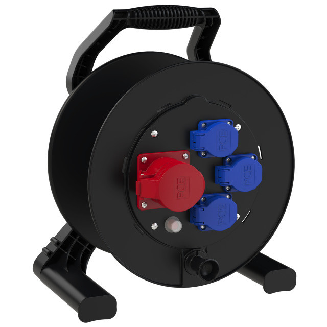 Kabeltrommel Ø310 Leertrommel; Kunststofftrommel (schwarz) mit zentral angeordneter Bremsvorrichtung; Stabiles Kunststoffgestell (schwarz) mit ergonomisch geformtem Tragegriff und 2 Steckerparkplätzen; Zentralscheibe mit 1 CEE Anbausteckdose 16/5 6h 400V (315-6f7); 3 Schutzkontakt Anbausteckdosen österr./deutsch. System mit Klappdeckel und Dichtrand (105-0bsw) 16A/250V; Schutzart Anbaudosen: IP54; 1xThermoschutzschalter; Ausführung inkl. Schrauben und Verpackung