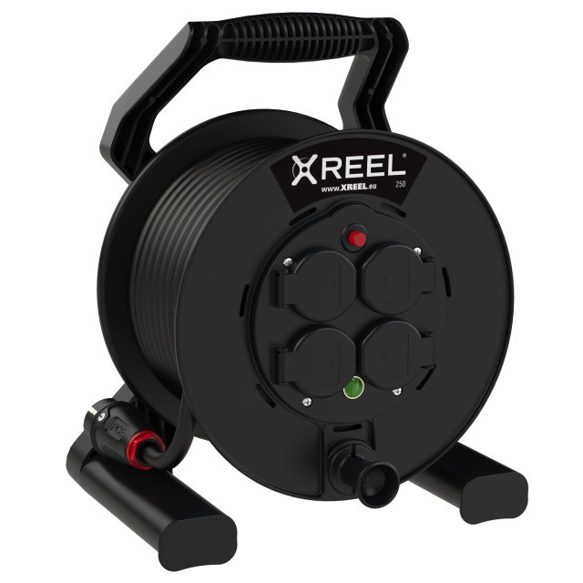 Kabeltrommel XREEL250; Kunststofftrommel (schwarz) mit zentral angeordneter, innenliegender Bremsvorrichtung; Abgedichteter Anschlussraum; Stabiles Kunststoffgestell (schwarz) mit ergonomisch geformtem Tragegriff und 2 Befestigungspositionen für den Stecker; Zentralscheibe mit 4 Schutzkontakt Anbausteckdosen belg./franz. System mit Klappdeckel und Shutter; Nennspannung: 250V ; Nennstrom: 16A; Schutzart: IP54; 1 Thermoschutzschalter; 1 Spannungskontrollleuchte (grün); 25m Kabel schwarz H05RR-F 3G1,5mm2; Taurus2 Schutzkontaktstecker Gummi 16A 2p+PE 250V IP54 (0521-sr) zweifaches Erdungssystem; XREEL250 betriebsfertig verdrahtet; Richtlinie (RoHS) 2011/65/EU; Niederspannungsrichtlinie NSpRl 2014/35/EU; Beständigkeit gegenüber UV-Strahlung nach ISO 4892-2; Normen: IEC / EN 61242