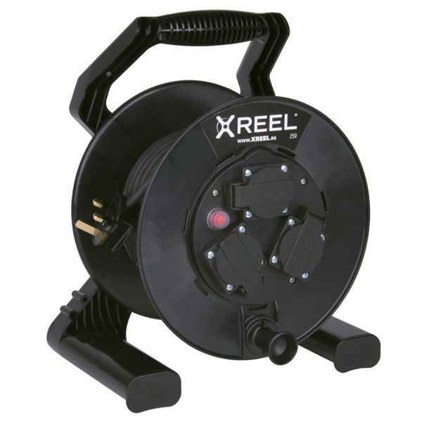 Kabeltrommel XREEL250; Kunststofftrommel (schwarz) mit zentral angeordneter, innenliegender Bremsvorrichtung; Abgedichteter Anschlussraum; Stabiles Kunststoffgestell (schwarz) mit ergonomisch geformtem Tragegriff; Zentralscheibe mit 3 Schutzkontakt Anbausteckdosen brit. System mit Klappdeckel (1020-5s); Nennspannung: 230V ; Nennstrom: 13A; Schutzart: IP54; 1 Thermoschutzschalter; 25m Kabel schwarz H07RN-F 3G1,5mm2; Stecker nach britischem System 13A (00200); XREEL250 betriebsfertig verdrahtet; Richtlinie (RoHS) 2011/65/EU; Niederspannungsrichtlinie NSpRl 2014/35/EU; Beständigkeit gegenüber UV-Strahlung nach ISO 4892-2; nach Norm IEC/EN 61242; Schutzart Gesamtsystem: IP32
