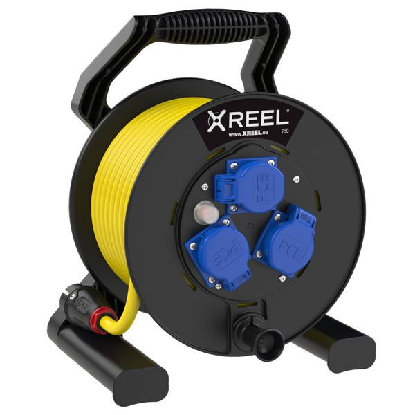 Kabeltrommel XREEL250; Kunststofftrommel (schwarz) mit zentral angeordneter, innenliegender Bremsvorrichtung; Abgedichteter Anschlussraum; Stabiles Kunststoffgestell (schwarz) mit ergonomisch geformtem Tragegriff; Zentralscheibe mit 3 Schutzkontakt Anbausteckdosen österr./deutsch. System mit Klappdeckel und Dichtrand (1050-0bsw); Nennspannung: 250V ; Nennstrom: 16A; Schutzart: IP54; 1 Thermoschutzschalter; 25m Kabel gelb N07V3V3-F 3G1,5mm2; Taurus2 Schutzkontaktstecker Vollgummi 16A 2p+PE 250V IP54 (0522-sr) zweifaches Erdungssystem; Kabeltrommel betriebsfertig verdrahtet; Richtlinie (RoHS) 2011/65/EU; Niederspannungsrichtlinie NSpRl 2014/35/EU; Beständigkeit gegenüber UV-Strahlung nach ISO 4892-2; nach Norm IEC/EN 61242; Schutzart Gesamtsystem: IP54