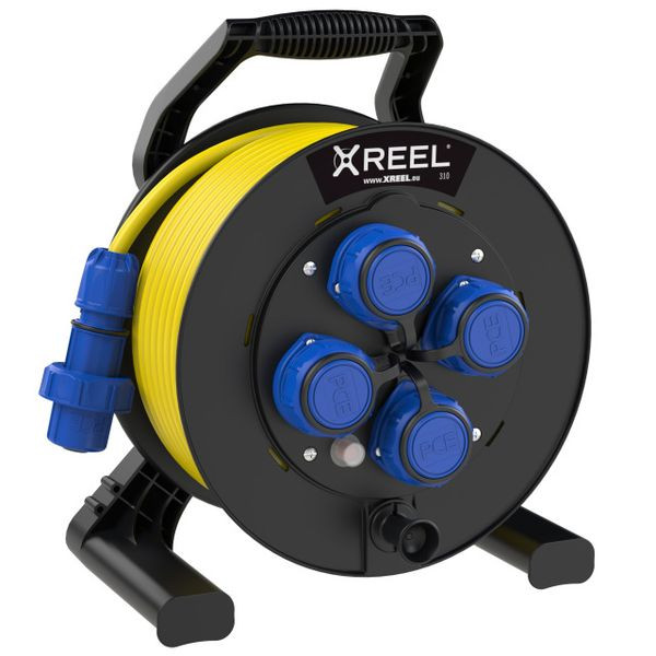 Kabeltrommel XREEL310; Kunststofftrommel (schwarz) mit zentral angeordneter, innenliegender Bremsvorrichtung; Abgedichteter Anschlussraum; Stabiles Kunststoffgestell (schwarz) mit ergonomisch geformtem Tragegriff; Zentralscheibe mit 4 wasserdichten Schutzkontakt Anbausteckdosen österr./deutsch. System (20351-9b); Nennspannung: 250V ; Nennstrom: 16A; Schutzart Anbaudosen: IP68; 25m Kabel gelb N07V3V3-F 3G2,5mm2; Schutzkontaktstecker Nautilus IP68 blau (20051-b); XREEL310 betriebsfertig verdrahtet; Richtlinie (RoHS) 2011/65/EU; Niederspannungsrichtlinie NSpRl 2014/35/EU; Beständigkeit gegenüber UV-Strahlung nach ISO 4892-2; nach Norm IEC/EN 61242; Schutzart Gesamtsystem: IP54