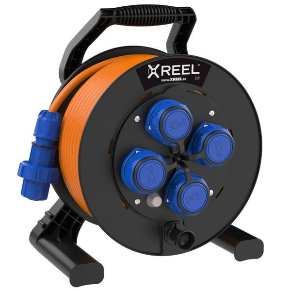 Kabeltrommel XREEL310; Kunststofftrommel (schwarz) mit zentral angeordneter, innenliegender Bremsvorrichtung; Abgedichteter Anschlussraum; Stabiles Kunststoffgestell (schwarz) mit ergonomisch geformtem Tragegriff; Zentralscheibe mit 4 wasserdichten Schutzkontakt Anbausteckdosen österr./deutsch. System (20351-9b); Nennspannung: 250V ; Nennstrom: 16A; Schutzart Anbaudosen: IP68; 25m Kabel orange H07BQ-F 3G2,5mm2; Schutzkontaktstecker Nautilus IP68 blau (20051-b); XREEL310 betriebsfertig verdrahtet; Richtlinie (RoHS) 2011/65/EU; Niederspannungsrichtlinie NSpRl 2014/35/EU; Beständigkeit gegenüber UV-Strahlung nach ISO 4892-2; nach Norm IEC/EN 61242; Schutzart Gesamtsystem: IP54; entspricht der BGI608 K2