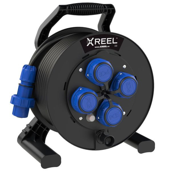 Kabeltrommel XREEL310; Kunststofftrommel (schwarz) mit zentral angeordneter, innenliegender Bremsvorrichtung; Abgedichteter Anschlussraum; Stabiles Kunststoffgestell (schwarz) mit ergonomisch geformtem Tragegriff; Zentralscheibe mit 4 wasserdichten Schutzkontakt Anbausteckdosen österr./deutsch. System (20351-9b); Nennspannung: 250V ; Nennstrom: 16A; Schutzart Anbaudosen: IP68; 25m Kabel schwarz H07RN-F 3G2,5mm2; Nautilus Schutzkontaktstecker IP68 blau (20051-b); XREEL310 betriebsfertig verdrahtet; Richtlinie (RoHS) 2011/65/EU; Niederspannungsrichtlinie NSpRl 2014/35/EU; Beständigkeit gegenüber UV-Strahlung nach ISO 4892-2; nach Norm IEC/EN 61242; Schutzart Gesamtsystem: IP54; entspricht der BGI608 K2