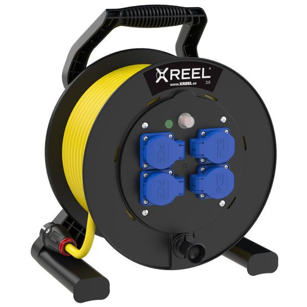 Kabeltrommel XREEL310; Kunststofftrommel (schwarz) mit zentral angeordneter, innenliegender Bremsvorrichtung; Abgedichteter Anschlussraum; Stabiles Kunststoffgestell (schwarz) mit ergonomisch geformtem Tragegriff und 2 Befestigungspositionen für den Stecker; Zentralscheibe mit 4 Schutzkontakt Anbausteckdosen österr./deutsch. System mit Klappdeckel und Dichtrand (105-0bsw); Nennspannung: 250V ; Nennstrom: 16A; Schutzart Anbaudosen: IP54; 1 Spannungskontrollleuchte; 30m Kabel gelb N07V3V3-F 3G1,5mm2; Taurus2 Schutzkontaktstecker Vollgummi 16A 2p+PE 250V IP54 (0522-sr) zweifaches Erdungssystem; XREEL310 betriebsfertig verdrahtet; Richtlinie (RoHS) 2011/65/EU; Niederspannungsrichtlinie NSpRl 2014/35/EU; Beständigkeit gegenüber UV-Strahlung nach ISO 4892-2; nach Norm IEC/EN 61242; Schutzart Gesamtsystem: IP54