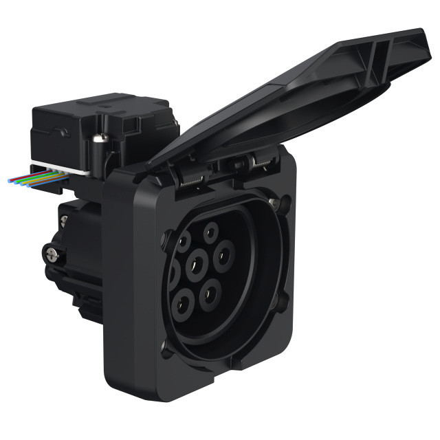 Infrastruktur-Anbausteckdose Typ2 zum Laden von Elektrofahrzeugen (EV) mit Wechselstrom (AC) bestehend aus:; Anbausteckdose Typ2 (AC 32A), Kontakte: Schraubanschluss, Messing vernickelt; Verriegelungsaktuator (DC 9-16V) ; Rahmen mit selbstschließendem Klappdeckel; Zwischenflansch (Vorderwandmontage); Flanschdichtung; Befestigungsschrauben; gem. IEC/EN 62196, Prüfzeichen: ÖVE und VDE; Schutzart: IP44/54
