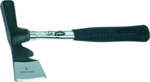 Gipserbeil mit Stahlrohrstiel und Kunststoffgriff, schwarz lackiert.