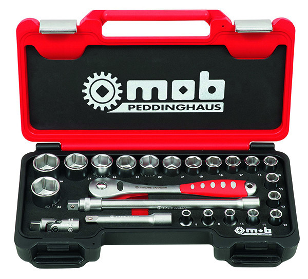23-teiliger, 1/2" Knarrensatz mit GDS Knarre ( 72 Zähne ) in FusionBox No.3, Inhalt: 1 GDS Knarre 1/2 Zoll, 19 Stecknüsse: 8-9-10-11-12-13-14-15-16-17-18-19-21-22-23-24-27-30-32mm, 1 Kardangelenk, 1 Click’n Hold Verlängerung 280mm, 1 Verlängerung 125mm