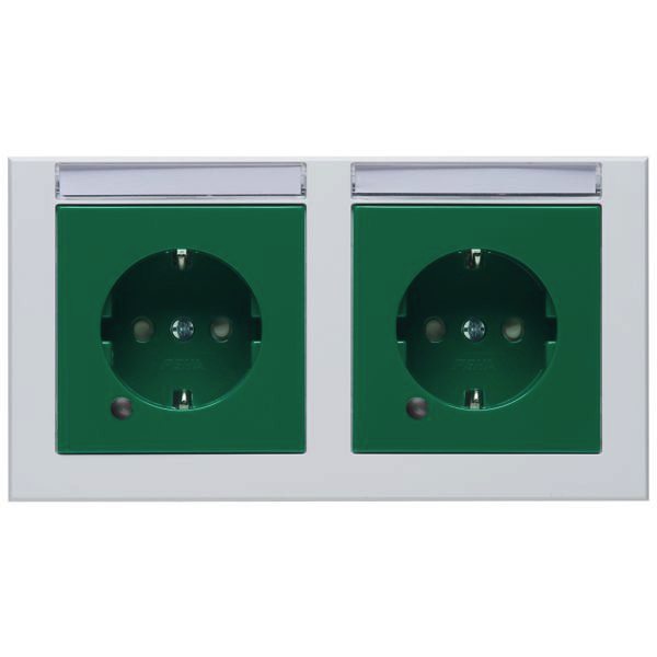 bestehend aus: (von links nach rechts) 2 -fach SCHUKO Steckdose mit Schraubklemmen, 2-polig, 10/16 A 250 V , mit grüner Abdeckung, Funktionskontrollleuchte grün, 2 -fach Rahmen, mit Beschriftungsfeld, mit integriertem Wieland gesis GST18 Steckverbinder, und halogenfreier Attema-Dose UHW50, Ausführung horizontal