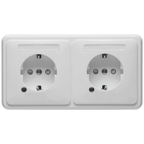 bestehend aus: (von links nach rechts) 2 -fach SCHUKO Steckdose mit Schraubklemmen, 2-polig, 10/16 A 250 V ?, mit erhöhtem Berührungsschutz, Funktionskontrollleuchte grün, mit Beschriftungsfeld, im 2 -fach Rahmen, mit Wieland gesis GST18 Steckverbinder, und halogenfreier Attema-Dose UHW50, Ausführung horizontal