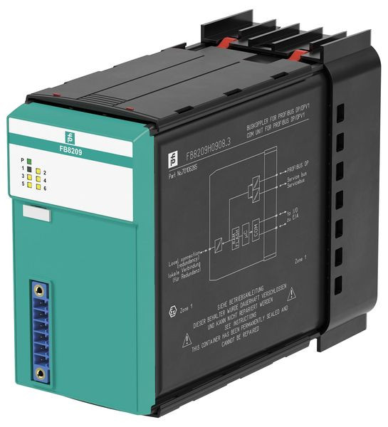 Schnittstelle zwischen E/A-Modulen und Leitsystem/Steuerung, Buskoppler für 80 analoge oder 184 binäre Kanäle, Kommunikation über PROFIBUS DP, Montage in geeigneten Gehäusen in Zone 1, Feldbustyp: PROFIBUS DP/DP-V1