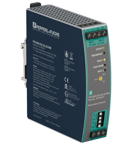 Eingang 24 V DC bis 28 V DC, 2 Eingänge mit 1 Ausgang, Ausgang 24 V DC, 20 A, Gehäusebreite 32 mm, Integrierte Entkopplungs-Mosfets für 1+1- und N+1-Redundanz, Automatische Lastverteilung, Verpolschutz des Eingangs, Einfache Verdrahtung: Verteilerklemme für Negativpol enthalten, Anzeige des Redundanzstatus, Geeignet für die Montage in Zone 2/Div. 2, Gerätetyp: Gerät für Hutschienenmontage, Funktion: Redundanzmodul, Spannungsbereich: 24 ... 28 V DC