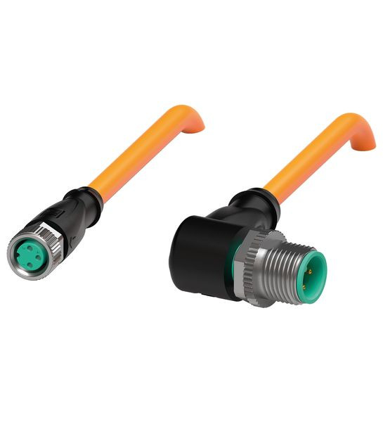 Verbindungskabel M8-Buchse gerade auf M12-Stecker gewinkelt A-kodiert, 3-polig, POC-Kabel schweißperlenbeständig orange, robotertauglich, torsionsgeeignet, ölbeständig, molekular vernetzt