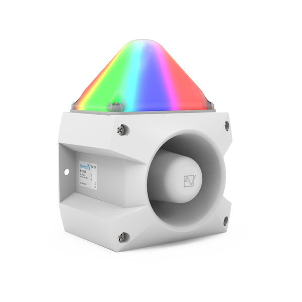 "Kompakter RGB-LED-Schallgeber in grau mit weißer Haube. Leuchtfarben gelb, rot, grün und blau frei einstellbar in nur einem Gerät