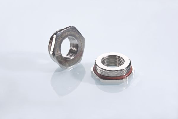 Ex-e Reduktion Ex eb / Ex tb (Sechskant - M- auf M-Gewinde), aus vernickeltem Messing, zum Verkleinern des Anschlussgewindes um 1...3 Größen, O-Ring aus Silikon, Schutzart IP 68 bis 10 bar, Temperaturbereich –60 bis 180 °C, Anschlussgewinde M20x1,5 auf M16x1,5