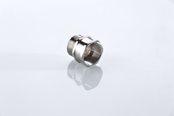 EMV Adapter Ex-d/Ex-e, aus vernickeltem Messing, zur Schaffung einer weiteren EMV Kontaktebene, sichere 360-Schirmkontaktierungüber Triangelfeder, hohe Stromtragfähigkeit, einfache und sichere Montage, Schutzarten IP 66 und IP 68 bis 10 bar, Anschlussgewinde M25x1,5