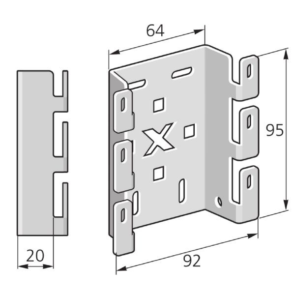 Gitter-Kanal Wandkonsole X10, zur senkrechen und waagerechten Montage von Gitter-Kanälen an seitlichen Flächen, Seitenhöhe 60 mm bis 110 mm, Drahtstärken bis 5 mm, Stahl, BxH 92x95 mm