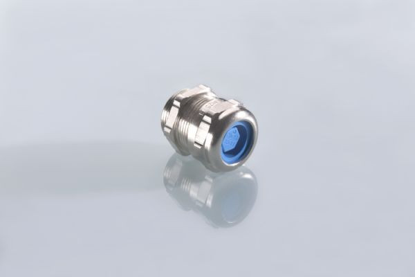 EMV-Kabelverschraubung blueglobe TRI NM, aus vernickeltem Messing, hohe Dämpfungswerte durch 360°-Schirmkontaktierung per nichtmagnetischer TRI-Feder aus Bronze, Dichteinsatz aus TPE inkl. heraustrennbarem Inlet zur Erweiterung des Dichtbereiches, großflächige und schonende Kabelabdichtung, Zugentlastung bis Klasse B nach EN 62444, O-Ring aus HNBR, Schutzarten IP 68bis 15 bar, IP 69 und Type 4X, sehr gute mechanische und thermische Eigenschaften, hohe Korrosions-, Verschleiß- und Vibrationsbeständigkeit, hohe UV-Stabilität, Anschlussgewinde M50x1,5