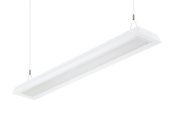1470x200 mm; H73 mm, Stahl, Weiß, Signalweiß (RAL9003), Abhängeset doppelt, dreieckig, Netzteil mit DALI-Schnittstelle, 6000 lm, 46.5 W, 129 lm/W, 4000 K, (0.43, 0.40) SDCM 3, CRI90, UGR19, Breitstrahlend (WB), Texturiert, Polykarbonat, ?IP20 | Fernhalten von Fingern, IK02 | 0,2 J Standard, SchutzklasseI, Schnellsteckverbinder, 5-polig