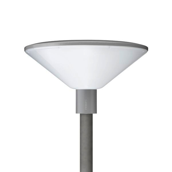 Urban road & street light, Aluminium, Silber, Mastspitze für Durchmesser 62mm, Netzteil mit DynaDimmer und konstantem Lichtstrom (integriert), Konstanter Lichtstrom und DynaDimmer mit festen Voreinstellungen, Version 1, 1900 lm, 32.5 W, 62 lm/W, 3000 K, (0.43, 0.40) SDCM 5, CRI80, Lichtverteilung symmetrisch, IP66 | Schutz gegen Eindringen von Staub, strahlwassergeschützt, IK10 | 20 J vandalismusgeschützt, SchutzklasseII, Überspannungsschutz bis 6 kV im Gegentaktmodus und bis 6 kV im Gleichtaktmodus, Schraubanschlussblock, 5-polig