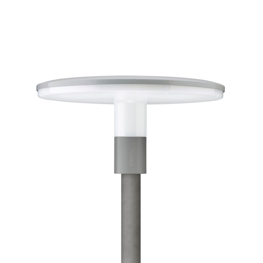 Urban road & street light, Aluminium, Silber, Mastspitze für Durchmesser 62mm, Netzteil mit DynaDimmer und konstantem Lichtstrom (integriert), Konstanter Lichtstrom und LumiStep, 8 Stunden, 1386 lm, 27 W, 53 lm/W, 3000 K, (0.43, 0.40) SDCM 5, CRI80, Lichtverteilung symmetrisch, IP66 | Schutz gegen Eindringen von Staub, strahlwassergeschützt, IK10 | 20 J vandalismusgeschützt, SchutzklasseII, Überspannungsschutz bis 6 kV im Gegentaktmodus und bis 6 kV im Gleichtaktmodus, Schraubanschlussblock, 5-polig