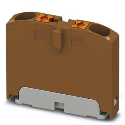 Verteilerblock, Grundklemme, Nennspannung: 450 V, Nennstrom: 24 A, Anschlussart: Push-in-Anschluss, Anzahl der Anschlüsse: 2, Querschnitt: 0,14 mm² - 4 mm², AWG: 26 - 12, Breite: 5,2 mm, Höhe: 21,7 mm, Farbe: braun, Montageart: aufrasten auf Tragschienenadapter, Direktmontage mit Flansch, Fliegend