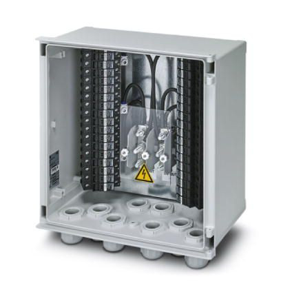 Generatoranschlusskasten für Photovoltaikanlagen bis 1000 V DC zum Anschluss von bis zu 18 Strings. Mit beidseitiger Absicherung über Sicherungshalter. Kabeleinführung über Mehrfachkabelverschraubung. Inklusive 15 A-Sicherungseinsätzen.