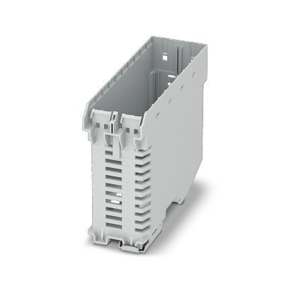 Tragschienengehäuse, Gehäuseunterteil mit Metallfußriegel, mit Lüftungsschlitzen, Breite: 37,89 mm, Höhe: 120,6 mm, Tiefe: 82,85 mm, Farbe: lichtgrau (ähnlich RAL 7035), Querverbindung: Tragschienen-Busverbinder (optional), Polzahl Querverbinder: 5 oder 8