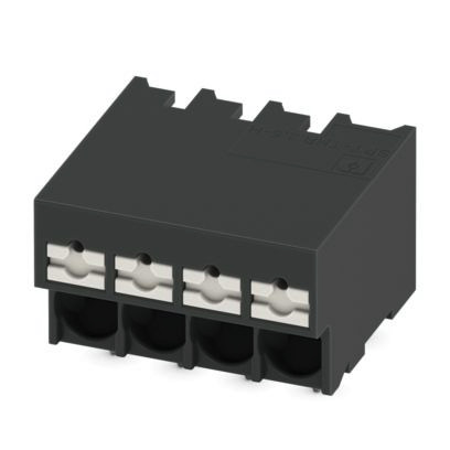 Leiterplattenklemme, Nennstrom: 32 A, Bemessungsspannung (III/2): 400 V, Nennquerschnitt: 4 mm², Anzahl der Potenziale: 4, Anzahl der Reihen: 1, Polzahl pro Reihe: 4, Artikelfamilie: SPT 2,5/..-H-THR, Rastermaß: 5 mm, Anschlussart: Push-in-Federanschluss, Montage: THR-Löten / Wellenlöten, Anschlussrichtung Leiter/Platine: 0 °, Farbe: schwarz, Pin-Layout: Lineares Pinning, Pinlänge [P]: 2,6 mm, Anzahl der Lötpins pro Potenzial: 2, Verpackungsart: verpackt im Karton