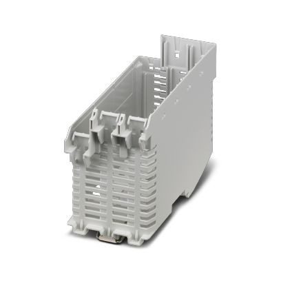 Tragschienengehäuse, Gehäuseunterteil mit Metallfußriegel, mit Lüftungsschlitzen, Breite: 56,88 mm, Höhe: 120,6 mm, Tiefe: 82,85 mm, Farbe: lichtgrau (ähnlich RAL 7035), Querverbindung: Tragschienen-Busverbinder (optional), Polzahl Querverbinder: 5 oder 8