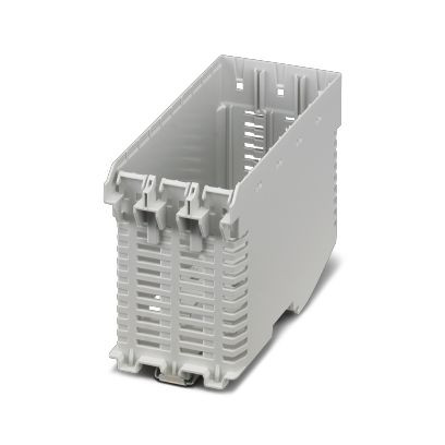 Tragschienengehäuse, Gehäuseunterteil mit Metallfußriegel, mit Lüftungsschlitzen, Breite: 56,88 mm, Höhe: 120,6 mm, Tiefe: 82,85 mm, Farbe: lichtgrau (ähnlich RAL 7035), Querverbindung: Tragschienen-Busverbinder (optional), Polzahl Querverbinder: 5 oder 8