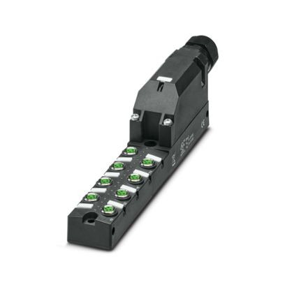 Verteilerbox, Anwendung: Standard, Anschlussart: M8-Buchse Metall, Anzahl der Steckplätze: 8, Polzahl: 4, Kodierung: A, Steckplatzbelegung: doppelt, Statusanzeige: ja, PNP; Stammleitungsanschluss: steckbarer Push-in-Federanschluss 180°, Schirmung: nein