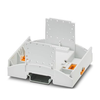 Tragschienengehäuse für den Einsatz in Installationsverteilern nach DIN 43880, Gehäuseunterteil mit Fußriegel, Breite: 71,6 mm, Höhe: 89,7 mm, Tiefe: 48,9 mm, Farbe: lichtgrau (ähnlich RAL 7035), Querverbindung: Tragschienen-Busverbinder (optional), Polzahl Querverbinder: 16