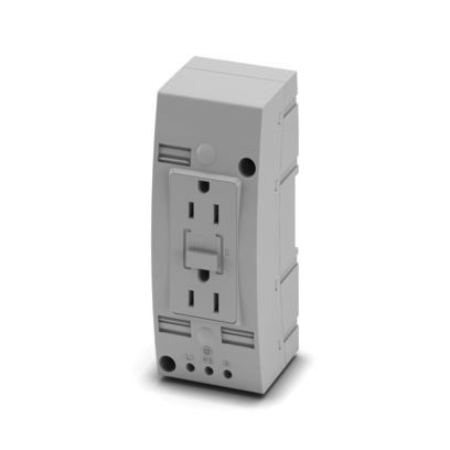 Doppelsteckdose, in vertikaler Anordnung, integrierter Fehlerstrom-Schutzschalter (GFCI Klasse A), Steckgesicht Typ AB 15A, Anschlussart: Schraubanschluss, Farbe: grau, Nennspannung: 125 V AC (60 Hz), Nennstrom: 15 A, Tragschienen- und Direktmontage, Normen/Bestimmungen: UL 508A, Länderkennzeichen: USA