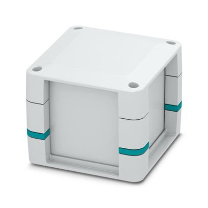 Komplettgehäuse für Leiterplatten, fixiert an den Eckeinlegern, Beinhaltet Gehäusehalbschalen, Seitenwände geschlossen, Eckeinleger mit Platinenbefestigung, Schrauben für Gehäuse und Platinenbefestigung, Gehäusefarbe lichtgrau mit Eckeinlegern türkisblau