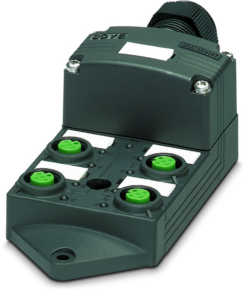 Verteilerbox, Anwendung: Standard, Anschlussart: M12-Buchse Kunststoff, Anzahl der Steckplätze: 4, Polzahl: 5, Kodierung: A, Steckplatzbelegung: doppelt, Statusanzeige: ja, PNP; Stammleitungsanschluss: Steckbarer Schraubanschluss 180°, Schirmung: nein