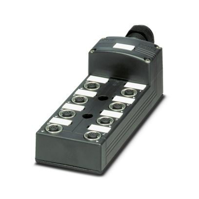 Verteilerbox, Anwendung: Außenbereiche, Anschlussart: M12-Buchse Metall, Anzahl der Steckplätze: 8, Polzahl: 5, Kodierung: A, Steckplatzbelegung: doppelt, Statusanzeige: nein, Universal; Stammleitungsanschluss: Steckbarer Schraubanschluss 180°, Schirmung: nein
