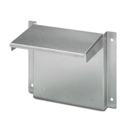 Wetterschutzdach zum Schutz des Generatoranschlusskastens (GAK) vor Umwelteinflüssen bei Montage im Außenbereich, aus Edelstahl, mit rückseitigem M8-Erdungsbolzen, inkl. Befestigungsmaterial für GAK und Erdungsleitung.